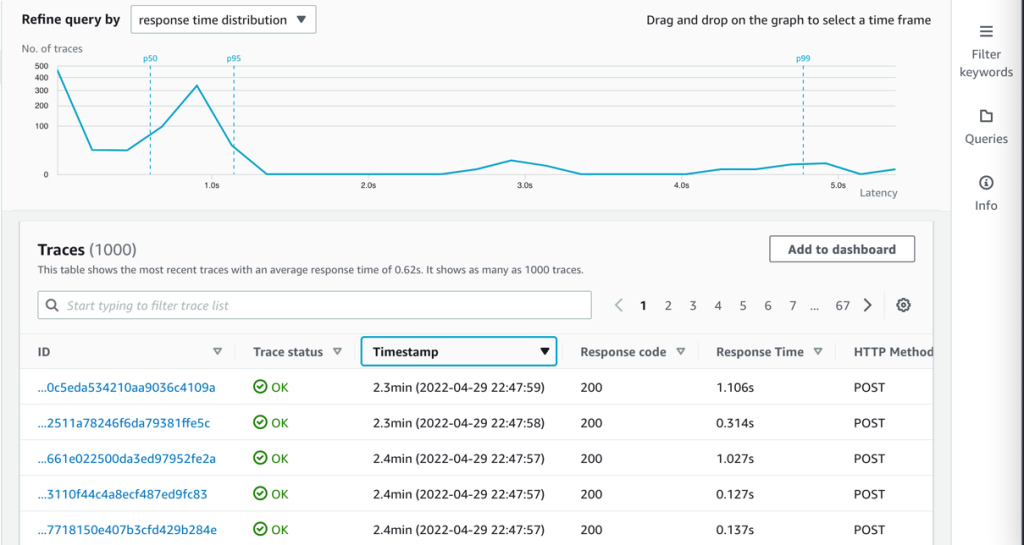 All components in this example integrate with AWS X-Ray. With AWS X-Ray, you can trace the entire application, which is useful to identify bottlenecks when load testing. You can also trace method execution at the Java method level.